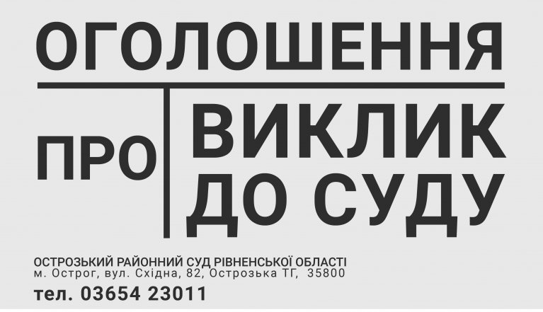 ОГОЛОШЕННЯ ПРО ВИКЛИК ДО СУДУ Відповідно до ч. 11 ст. 128 та ч. 2 ст. 129 Цивільного процесуального кодексу України, Острозький районний суд Рівненської області викликає Бордюк Надію Олександрівну, 24.05.2002 року народження, зареєстроване місце проживання: вул. Андрія ЛОЗЮКА, буд. 13 м. Острог Рівненського району Рівненської області 35800 як відповідача, в судове засідання у цивільній справі №567/151/26 (провадження №2/567/358/26) за позовною заявою Товариства з обмеженою відповідальністю "КОЛЛЕКТ ЦЕНТР" до БОРДЮК Надії Олександрівни про стягнення заборгованості за кредитним договором, яке відбудеться 16 березня 2026 року о 10 годині 20 хвилин в приміщенні Острозького районного суду за адресом: м. Острог, вул. Східна, 82 Рівненської області. Відповідно до ч. 11 ст. 128 Цивільного процесуального кодексу України відповідач, третя особа, свідок, зареєстроване місце проживання (перебування), місцезнаходження чи місце роботи якого невідоме, а також заінтересована особа у справах про видачу обмежувального припису викликаються до суду через оголошення на офіційному веб-сайті судової влади України, яке повинно бути розміщене не пізніше ніж за десять днів, а у разі розгляду справи про видачу обмежувального припису - не пізніше 24 годин до дати відповідного судового засідання. З опублікуванням оголошення про виклик особа вважається повідомленою про дату, час і місце розгляду справи. Відповідно до ст. 223 ЦПК України, в разі неявки у судове засідання учасника, який належним чином повідомлений про по час та місце його проведення, без поважних причин або без повідомлення причин неявки, суд розглядає справу за відсутності такого учасника. У разі повторної неявки в судове засідання відповідача, повідомленого належним чином, суд вирішує справу на підставі наявних у ній даних чи доказів (постановляє заочне рішення). Суддя Назарук В.А.